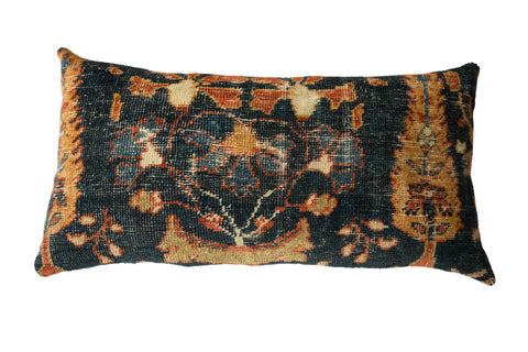 :: Reclaimed antique Ziegler Mahal rug fragment circa 1870 made into a lovely pillow! This fragment contains imagery of delicate bells of floral design and cypress trees along with great saturation of sapphire blue, deep teal navy, and rich terracotta. Newly made in Bedford, NY this pillow comes with a down insert. Newly made featuring an antique rug fragment that itself may show signs of use and age including but not limited to foundation showing, fade, etc. This fragment shows signs of minor, older, touchups. Recently professionally cleaned ready for in-home use! Many years of enjoyment to come with this handmade vintage rug fragment pillow. Size measures approximately: 18" x 34" x 8".
