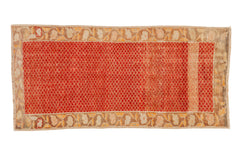 :: Covered field in lattice trellis design motif with diamond shaped minor panels bearing heavy abrashes across. Main border in a meandering vine and blossom design rendering. Colors and shades include: Cherry red, pomegranate red, saffron yellow, ivory, oxidized silver, pale tangerine orange, and more. Condition notes: Even wear across to knot heads with faint foundation showing through. Most of the original side cord selvages are intact or restored. Fully secured sides and ends. Possible minor professional reduction to perimeter. For processing purposes, this and other rugs of the type may have painted numbers on the reverse side. Recently professionally cleaned ready for in-home use! Many years of enjoyment to come with this hand knotted Turkish Oushak rug runner made in Turkey circa 1970's vintage. Size measures 2' x 4'1".
