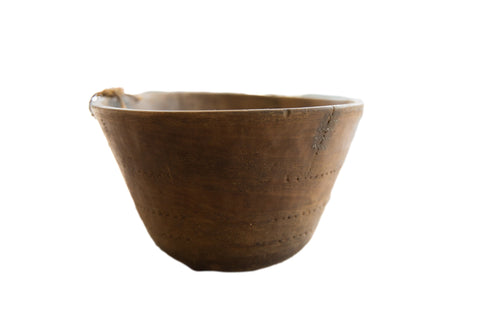 :: Vintage handmade African wooden bowl with tons of character and charm. Circa 1930s, believed to be from the Tuareg people in/around Niger. Please note this is an aged and lived with item, and as such it may have cracks, repairs, chips and/or imperfections. Kindly reference photographs for which of these may apply. Size measures: 11" x 11" x 7.5".