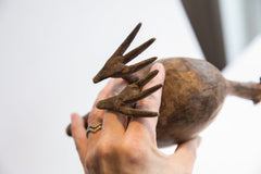 :: Vintage handmade African bird casting. Circa mid 20th century, each figure in this collection represents a different variation of protection and spirit used inside and outside of the local homes. These are beautiful collectibles that you or someone you love will cherish forever. As this item is in vintage condition, it may show signs of age and use. Size measures: 3" x 8" x 7".
