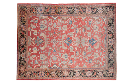 :: Spectacular antique Sultanabad carpet. Deep brick red field with large scale motif in sprawling allover pattern. Stunning blues, earth tones, and happy feel with unique character and merit. Many nuances! Will be an absolute joy to decorate with! Many years of enjoyment to come with this rug! Recently professionally cleaned, ready for in-home use. Exact size measures 10'4" x 13'3".
