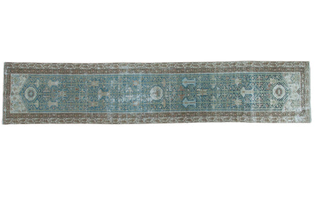 :: Elongated stemmed floral columns spanning the longitudinal field with lattice style outline relief atop a saturated sky blue. Colors include celadon green, powder blue, and wooded tones in the brown family ranging from light to dark. Finely woven carpet with great dynamic and implied energy through woven renderings. Fully secured sides and ends with reduction to both. Distressed aesthetic showing wear and foundation texture. Recently professionally cleaned ready for in-home use! Many years of enjoyment to come with this hand knotted distressed Persian Malayer rug runner circa 1920's. Exact size measures 2'6" x 12'7".
