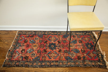 :: Small Persian Lilihan Sarouk in red. Fun carpet in mostly original tattered condition. Recently professionally cleaned and ready for use in home. Many years of enjoyment to come with this rug! Measures 2'6" x 4'6".