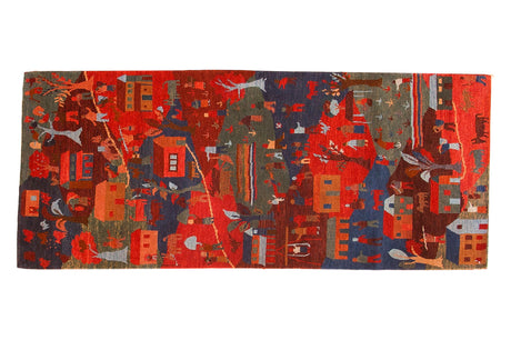 :: Hand knotted with a plush pile and cotton foundation, each individual folk art carpet in this collection are woven in virgin wool, dyed with age-old techniques of natural vegetable derived dyes.Shades of blue are derived from natural indigo, the reds from madder root base. Production is rather limited, and within the range of related carpets we offer from this village-woven Tibetan line, each piece exemplifies true, authentic, artistic merit: No two carpets the same. The pictorial imagery demonstrates a day in the life of herding, farming and mountainous region in which the natives reside.Condition Notes: In new, unused condition, ready for in-home use! Many years of enjoyment to come with this hand knotted Tibetan folk art rug runner woven within the last 15 years. Exact size measures 2'6" x 6'.