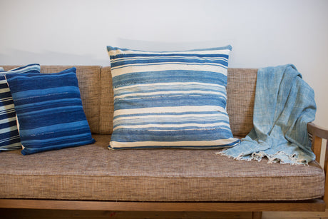 Introducing our line of vintage and antique African indigo textiles repurposed into beautiful and versatile pillow-cases -- made in house in NY by Old New House® personally. Backed with heavy-weight cotton canvas with an envelope enclosure featuring unique double color (black and white) stitch. Each pillow-case comes complete with 100% all natural made in USA Kapok pillow insert (wrapped in organic cotton). This particular striped pillow features light indigo blue shades with subtle contrast of ivory / off-white natural cotton. It is an older finely woven textile with a lot of mending and darning.