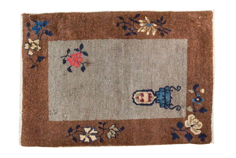 :: Antique Chinese Fette-Li rug mat. Awesome bronze border with scattered floral arrangements and tendrils. Field features an antique Chinese vase atop a grey ground. Some areas of localized wear. Ends and sides recently professionally secured. Recently professionally cleaned ready for in-home use! Many years of enjoyment to come with this hand knotted rug circa 1910. Exact size measures 2' x 2'11".