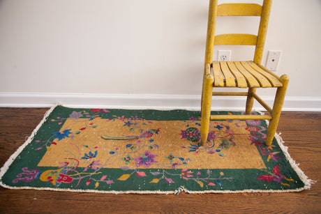 :: Authentic vintage 1920s Chinese art deco carpet with deep gold field and forest green border. Multiple vases, floral tendrils and blossoms, a bird, butterfly - Great imagery and really fun colors. Healthy condition in slightly tattered shape. Slight loss to selvage, a bit to either end. Overall even wear with exposed white knots. Carpet sold in as-is condition which is fine, although could benefit from overcasting if intended for high traffic area (additional). Recently professionally cleaned and ready for use in home. Many years of enjoyment to come with this rug! Size measures 2' x 4'