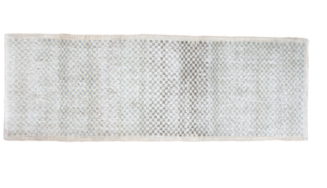 :: Vintage checker motif Turkish carpet with ivory / silver, stunning deep but faded and airy sea foam green and charcoal. Will be a joy to decorate with! Many years of enjoyment to come with this rug! Recently professionally cleaned, ready for in-home use. Exact size measures 2'1" x 5'10".