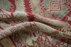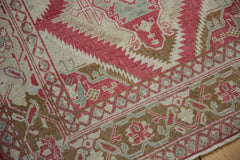 :: Double lighting serrated main medallions with splayed reciprocal medallions in the field overlay wrapped by a boteh and palmette main border with interconnecting vines. Heavy abrashes across. Colors and shades include: Raspberry red, antique ivory, pale dusty bronze, seafoam green blue, dusty powder blue, deep mauve cochineal, sand, and more. Condition notes: Mostly even wear across to knot heads. Most of the original side cord selvages are intact or restored. Fully secured sides and ends. Recently professionally cleaned ready for in-home use! Many years of enjoyment to come with this hand knotted Caucasian rug made in the Caucasus region circa 1960's vintage. Size measures 3'6" x 5'7".