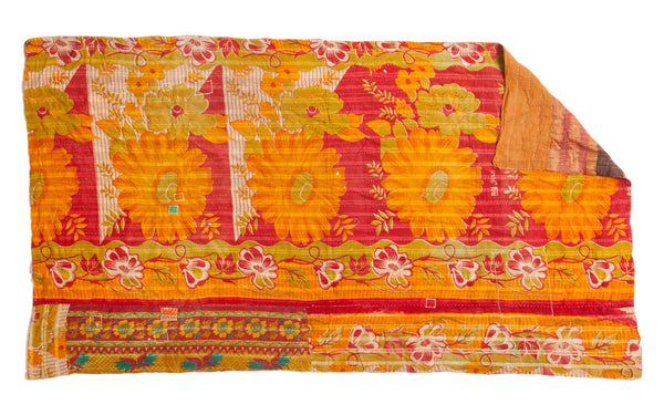 :: Vibrant one of a kind twin size quilt / throw featuring the extraordinary Kantha hand-stitch connecting upcycled vintage Indian cotton saris. This colorful and beautiful textile is estimated to be 30-50 years old and has such boho spirit! Double sided for two aesthetics! Please note that due to its vintage nature, there may be small stains or imperfections or patched areas. Exact size measures 3'7" x 6'4".