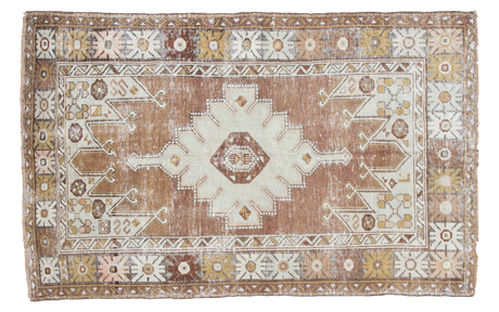 :: Unique bronze beige and pale ivory vintage Turkish distressed Oushak rug. Great geometric motif and plenty of earth-tone shades to make this a wonderful neutral accent rug or just the right unique character to design a room around! Many years of enjoyment to come with this rug! Recently professionally cleaned, ready for in-home use. Exact size measures 3'7" x 5'9".