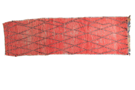 :: Lattice oriented design motif sprawling diagonally through the carpet creating narrow repeating diamond shaped panels atop a faded cinnabar red field. Other colors include navy and light blush. Unique to this particular runner is the rag rug construction fused with cut pile weave. Recently professionally cleaned ready for in-home use! Many years of enjoyment to come with this vintage hand knotted Moroccan rug runner woven circa 1980's. Exact size measures 3'2" x 10'8".