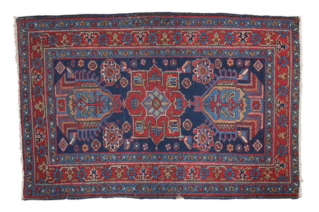 :: Bold small rug with powerful shades of deep indigo blue and rich cherry wine red. Star border with meandering leaf minor borders adding to the harmony and flow.Even wear across. Secure sides and ends. One area of low pile close to the edge measuring approximately 2"x1". Recently professionally cleaned ready for in-home use! Many years of enjoyment to come with this vintage distressed hand knotted Persian Heriz rug woven circa 1930's. Exact size measures 3' x 4'6".