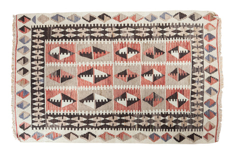 :: Alternating panels of reciprocating guls in various contrasting colors enveloped with diamond motif. Enjoy shades of faded cochineal red, ivory, charcoal black and abrashes thereof. Recently professionally cleaned ready for in-home use! Many years of enjoyment to come with this distressed hand woven Turkish Kilim rug circa 1990's vintage. Exact size measures 3'2" x 5'.