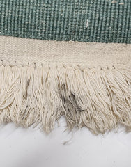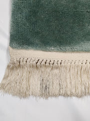 :: Unidirectional floral bouquet with blossomed tone on tone floral cross sections and a minor roundel medallion with a hut in a pictorial scene. Very high quality and dense wool with great longevity and thick pile. Colors and shades include: Pale aqua blue, jade green, saffron yellow, ivory, fuchsia, pale coffee brown and more. Condition notes: Like-new, original full pile height even across. Original side cord selvages intact. Fully secured sides and ends. Some old and untreated light staining to approximately 1" of the backside of the fringe on one end, kindly reference photos. Recently professionally cleaned ready for in-home use! Many years of enjoyment to come with this hand knotted Japanese Peking design rug made in Japan circa 1950's vintage. Size measures 2'11" x 4'10".