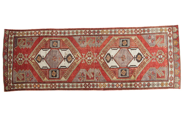 ::Double medallion rug runner with latch design. Great tribal and geometric feel with rectilinear weaving. Colors include silver, grey, tangerine orange, muted gold and brick red. Recently professionally cleaned ready for in-home use! Many years of enjoyment to come with this distressed hand knotted Turkish Oushak rug runner circa 1950's vintage. Exact size measures 4'3" x 12'3".