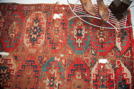 :: Old tribal rug with repeating and alternating woven interpretations of colorful pomegranates. Would make for an awesome display piece or rug. As is with holes, wear and tatter. May have been professionally reduced at one end. Measurements: 3'10" x 5'4"