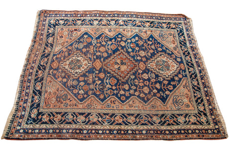 :: Saturated medium blue field with triple medallions. Wonderful range of earth tones, and particularly beautiful shades of chestnut browns. Woven approximately 1910 or earlier. Many years of enjoyment to come! Recently professionally cleaned, ready for in-home use. Measures 3'9" x 4'9".