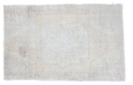 :: Soft lemony beige distressed rug with ivory, rose, and platinum throughout. Many years of enjoyment to come with this rug! Recently professionally cleaned, ready for in-home use. Exact size measures 4'3" x 6'7".