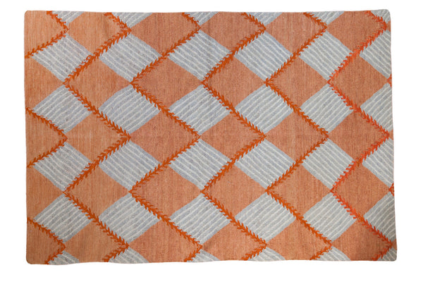 :: New hand-woven kilim rug with terra cotta diamonds paired with grey and platinum diamonds in argyle style. Adding to the dimension of the design, an art silk chevron motif overlays the pattern of this rug. A good quality weave and unique decorative aesthetic. Materials include wool, cotton and art silk (orange). Many years of enjoyment to come with this rug! Recently professionally cleaned, ready for in-home use. This brand new, vintage inspired area rug measures4'1" x 6'.