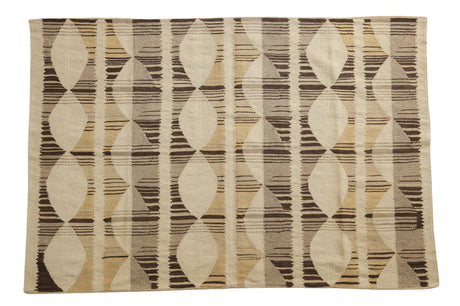 :: Fun and playful pattern in this modern Kilim rug. Pattern of alternating stripes and diamond-shape design. Colors and shades include ivory, mellow gold, yellow, grey, chocolate brown, black. Condition notes: excellent, unused condition with fully secured sides and ends. Recently professionally cleaned ready for in-home use! Many years of enjoyment to come with this hand woven Egyptian rug. Exact size measures 4'2" x 6'2".