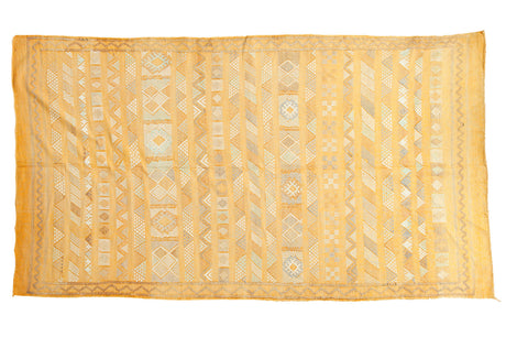 :: Fun and funky saffron yellow embroidered kilim. Finely woven with detailed embellishments throughout in decorative stripes, serpent motifs, geometric floral guls, and alternating coloration. Colors include faded mint green, soft sea foam, ivory, light blue and beige. Recently professionally cleaned ready for in-home use! Many years of enjoyment to come with this new Moroccan Kilim rug woven circa 2010's. Exact size measures 4'3" x 7'7".