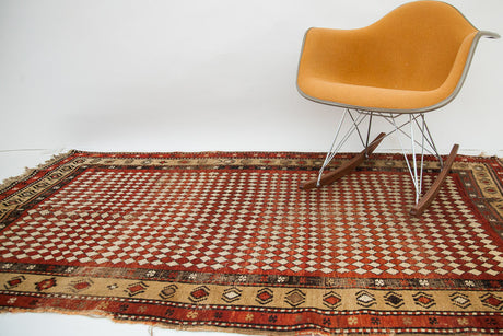 :: Antique Caucasian rug likely woven by Armenian weavers. Fantastic dark madder red rust color with super beautiful and unique diamond harlequin design. Even wear some areas of exposed foundation. Other areas recessed to foundation due to oxidizing age. Carpet could benefit from some stabilization to sides (additional), although in a low traffic area would serve well. Measurements: 3'9" x 6'9".