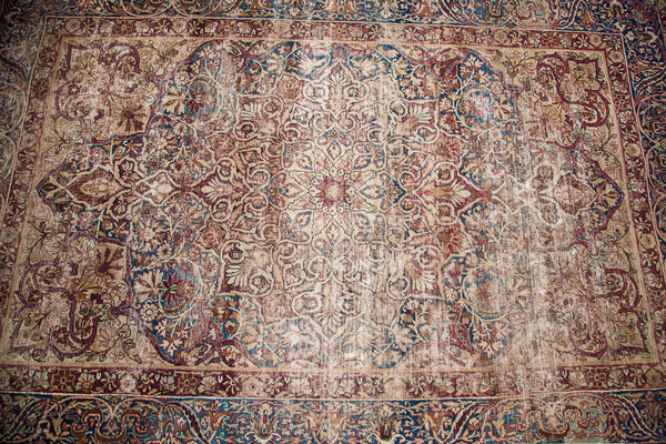 :: Antique Persian Kerman rug with large center medallion atop indigo field. Carpet features unusual cloudband border. Approximate weaving date circa conservative 1895. Fairly heavy wear across the center area of the rug. Carpet is in mostly original condition with minor loss to edges and sides. Threadbare areas and tattering across. Each end could benefit from stabilization/overcasting (additional), although is not necessary. The carpet is free of any major repairs, does have a line of glue on each outer minor border to prevent loss to ends. Measurements: 4'5" x 6'7".