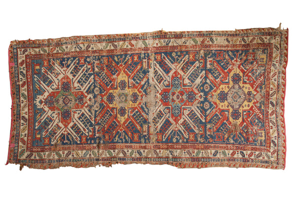 :: Unusual and hard to find quadruple eagle style medallion Soumac. A plethora of colors, all in brilliant vivid gem tones. Colors and shades include: Navy blue, sky blue, saffron yellow, cherry red rust, aubergine purple, emerald green, and more. Condition notes: Hard tatter all over and across mostly to either side, although several interior holes and splits. Numerous areas of foundation showing through. Widest width measured, other end approximately 5" narrower. Recently professionally cleaned ready for in-home use! Many years of enjoyment to come with this hand-woven Persian eagle Soumac rug runner made in Persia circa 1880's vintage. Exact size measures 5'3" x 10'4".
