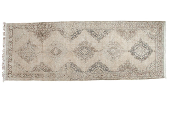 :: Quintuplet center medallions with lattice oriented staggered medallions. Awesome shades of soft ivory, beige, coffee bronze, pewter and wooded tones with a hint of celadon green. Unusual and hard to find dimensions. Recently professionally cleaned ready for in-home use! Many years of enjoyment to come with this distressed hand knotted Turkish Sparta rug runner circa 1950's vintage. Exact size measures 4'11" x 13'2".