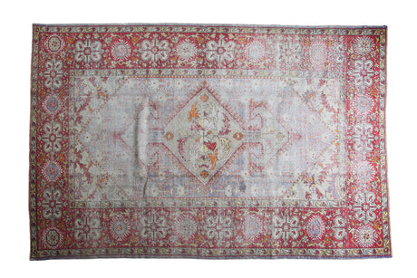 :: Stunning large scale design vintage 1940's Turkish Oushak. Dramatic oversize cross sections of flowers and fruits. Large bold medallion with sickle shaped leaves motioning to either side of the rug, harnessed by arrow shaped lanterns. Soft shades of tone-on-tone in the ivory, grey, steel color pared with deep brick red, oranges and yellows make this unique carpet stand out with a subtle boldness. Many years of enjoyment to come with this rug! Recently professionally cleaned, ready for in-home use. Exact size measures 6'8" x 10'.