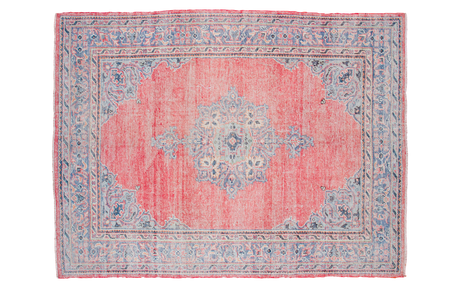:: Bold + happy vintage distressed Oushak rug ca. 1950's. Bright red field and sky blue border with soft mint green accents and ivory/beige top colors. Lovely carpet, will be a joy to decorate with! Many years of enjoyment to come with this rug! Recently professionally cleaned, ready for in-home use. Exact size measures 6'6" x 8'7".