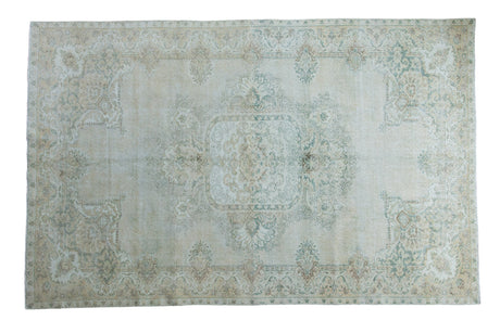 :: Vintage center medallion distressed Oushak carpet from Turkey circa 1950. Soft blanched shades of ivory, greens, beiges, tans and golds throughout. Many years of enjoyment to come with this rug! Recently professionally cleaned, ready for in-home use. Exact size measures 6' x 9'5".