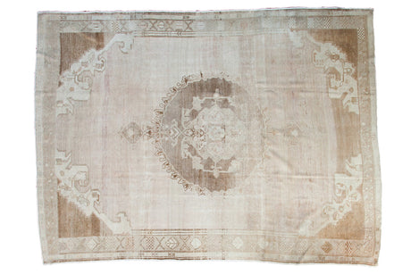 :: Vintage Oushak carpet with ornate center medallion and corner spandrels. Lovely abrashes and great tone on tone throughout. Colors include ivory, light grey and blanched wooded tones. Recently professionally cleaned ready for in-home use! Many years of enjoyment to come with this hand knotted Turkish Oushak carpet circa 1950's vintage. Exact size measures 8'5" x 11'1".