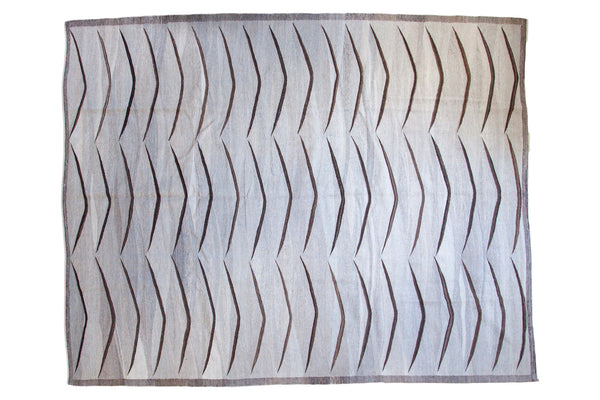 :: Simplistic and modern design with repeating bowed mountain design. Colors and shades include grey, silver, platinum, dark charcoal black. Condition notes: new unused condition with fully secured sides and ends. Recently professionally cleaned ready for in-home use! Many years of enjoyment to come with this hand woven Afghan carpet. Exact size measures 7'10" x 9'11".