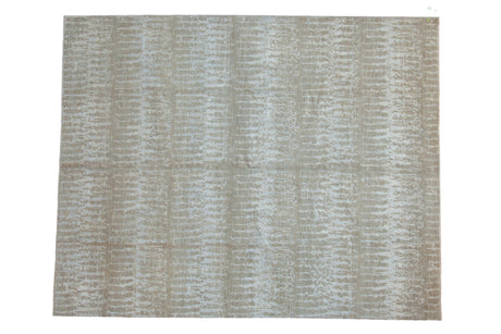 :: Contemporary design with vertically elongated repeating yet nuanced design elements atop an abrashed field. Lighter shaded non grey pile constituted of simulated silk - soft to the touch with high sheen and luster. Colors and shades include: Oxidized silver, silver, powder slate blue, and more. Condition notes: Like-new, original full pile height even across. Original side cord selvages intact. Fully secured sides and ends. Recently professionally cleaned ready for in-home use! Many years of enjoyment to come with this hand knotted Pakistani Contemporary design carpet made in Pakistan circa 2015 thru 2019 / new production vintage. Size measures 8' x 10'.