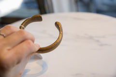 :: Antique handmade African bronze snake cuff bracelet. Exceptional antique circa early 19th century or older bracelet. Thought to be worn in order to protect the wearer from snake bites, though possibly used for currency as well. This piece is unique collectible, with great craftsmanship having gone into its creation! As this item is antique, it may show signs of use, age, and/or oxidation. Please note that the sizes within this listing are approximate, and if you need the exact size please contact us prior to purchase. Size measures from outside edge: 3.5" x 0.5" x 3.25" with inside measurement coming to 2 3/4" wide x 2 1/2" long and the gap measuring 1 1/8".