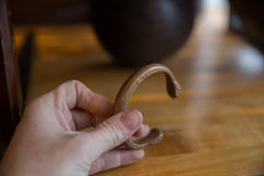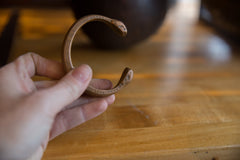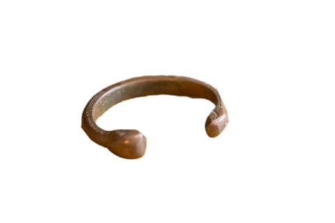 :: Antique handmade African copper snake cuff bracelet. Exceptional antique circa 19th century or older bracelet. Thought to be worn in order to protect the wearer from snake bites, though also given as part of a Dowry as a form of currency and to symbolize fertility in the new marriage. This piece is unique collectible, with great craftsmanship having gone into its creation! As this item is antique, it may show signs of use, age, and/or oxidation. Please note that the sizes within this listing are approximate, and if you need the exact size please contact us prior to purchase. Size Measures: 0.5" x 3" x 2.5"