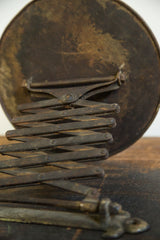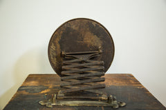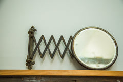 :: So beautiful and highly sought after beveled glass adjustable accordion shaving mirror with its original fleur de lis hardware and absolutely amazing darkened patina. Vintage / antique circa 1910s / 1920s. In overall good aged condition, still functioning very nicely with only notes being some rust and markings on glass. It would look great bunched up in the corner or extended hanging down on the wall. Could install it as was originally intended as well. Mirror size measures 8" diameter and is extendable up to 18"!