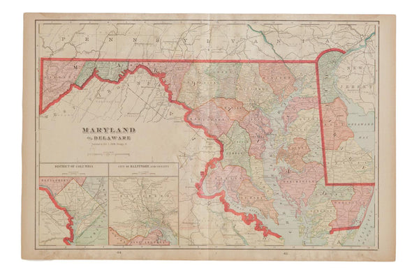 :: From Cram's Unrivaled Atlas of the World 1907 Edition, a map of Maryland that measures 23.5" x 14.5". Page Numbers of original atlas index are: 44,45/46,43. In very good to good condition, showing minimal signs of use and age including but not limited to: discoloration, oxidation, small rips, and some disconnection of papers.