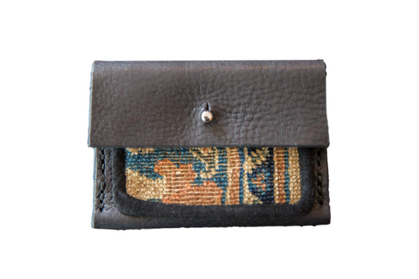 :: Featuring an ONH exclusive rug fragment made into this beyond adorable mini wallet, handmade by luxury handbag UK brand Swag and Tassel. As their first USA distributor, we are so excited to share the amazing craftsmanship, quality, and aesthetic of their handmade accessories. Features vegetable tanned leather, cotton detailing, and our unique gorgeous rug remnant. Measures 3" x 4.5".