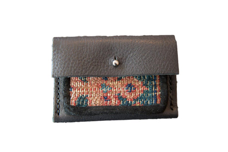:: Featuring an ONH exclusive rug fragment made into this beyond adorable mini wallet, handmade by luxury handbag UK brand Swag and Tassel. As their first USA distributor, we are so excited to share the amazing craftsmanship, quality, and aesthetic of their handmade accessories. Features vegetable tanned leather, cotton detailing, and our unique gorgeous rug remnant. Measures 3" x 4.5".