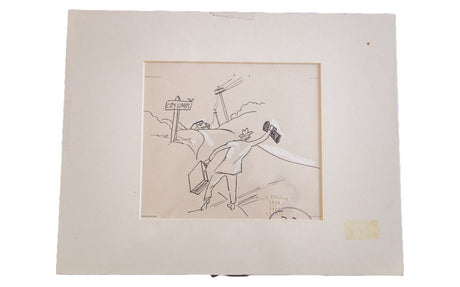 :: Hilarious hitchhiking man near the edge of a city. With one arm long extended with what appears to be a black horn case, and in the other hand a briefcase. Is he an artist? A businessman? Either way, he definitely wants a ride in the classic old car rolling up the hill his way! Hand drawn original made with India ink and corrective wash on paper with mat board. Presumably circa late 1970's: Stamped DON FREEMAN 1908 - 1978 ESTATE, partially concealed signature and circle in marker located in the lower right. Authentication papers sealed inside with artist bio by Sullivan Goss Books & Prints, Santa Barbara, CA. Condition: Art is enclosed in gallery wrapped and sealed plastic lining. Appears to be in as-made condition, with no noticeable condition issues. Full size measures 14" x 11" and cropped, the dimensions would be 7.23" x 6.25".