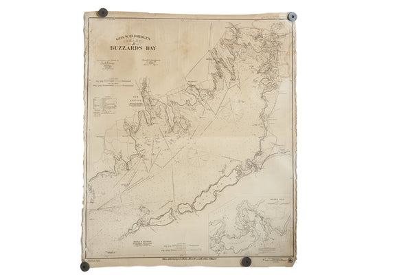 :: Geo. W. Eldridge's nautical map of Buzzards Bay (Chart J). Some areas of note include Nashawena, New Bedford, and more. This item is in vintage condition and shows some signs of use and age. Kindly refer to photographs for condition. Approximate size measures 29" x 34".