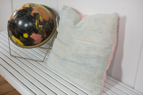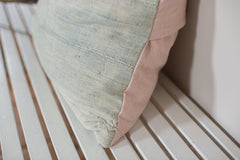:: Old New House Original and exclusive handmade pillow featuring reclaimed vintage African Indigo textile fragment. Perfectly sun-faded, this indigo's coloring is beyond lovely. Enjoy a lovingly made in house ONH throw pillow! 100% European linen faded pink back. Features envelope enclosure: Price includes made in USA luxurious, all-natural Kapok inserts with organic cotton covers. Exact size measures 20" x 20" x 5".