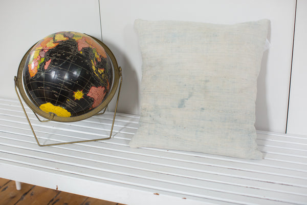 :: Old New House® Original and exclusive handmade pillow featuring reclaimed vintage African Indigo textile fragment. Perfectly sun-faded, this indigo's coloring is beyond lovely. Enjoy a lovingly made in house ONH throw pillow! 100% European linen grey back. Features envelope enclosure: Price includes made in USA luxurious, all-natural Kapok inserts with organic cotton covers. Exact size measures 20" x 20" x 5".