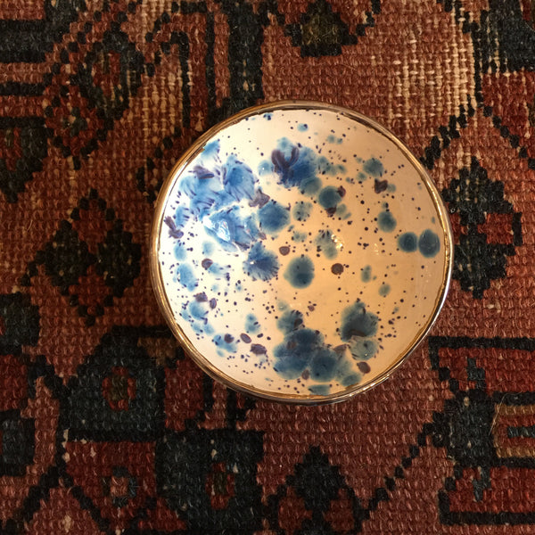 :: This bowl was hand built and pinched to make it extra lovely. Made in Minneappolis, Minnesota by A MANO. Hand-painted with different glazes and crystal glazes and a silver lustre rim. It's a little uneven and extra sweet.