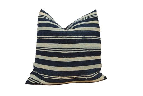 :: Vintage African textile fragment circa mid 20th century featuring lovely shades of indigo and stripes sourced by ONH and handmade into a large throw pillow that is perfect for the bed or sofa. Backed with navy linen blend fabric that ties in perfectly. As the remnant used to make the pillow is vintage there may be some signs of age and use on the fragment side - including but not limited to darning, slight discoloration, showing thread where strips were sewn together originally, etc. Size measures approximately: 16"x16". Contact us with any questions!