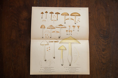 :: Authentic antique color fungi lithograph dating to the late 1800's just before the turn of the century. Excellent earthy colors of brown, yellow, grey with detailed illustration of mushroom cross sections and groupings including: 1. Chestnut Inocybe (Inocybe Castanea) 2. Excoriated Inocybe (Incoybe Excoriata) 3. Two Colored Tricholoma (Tricholoma Subluteum) 4. Scaly Disked Inocybe (Inocybe Squamosodisca) 5. Fallacious Inocybe (Inocybe Fallax) 6. Burt's Stereum (Stereum Burtianum). This item will be shipped folded in half along it's original crease. Condition: Slightly fragile, particularly across fold which runs horizontal through the center of the piece. Minor tears, some signs of handling. Golden tint even around edges. Full size measures 9" x 10.875" and cropped, the dimensions would be slightly smaller.