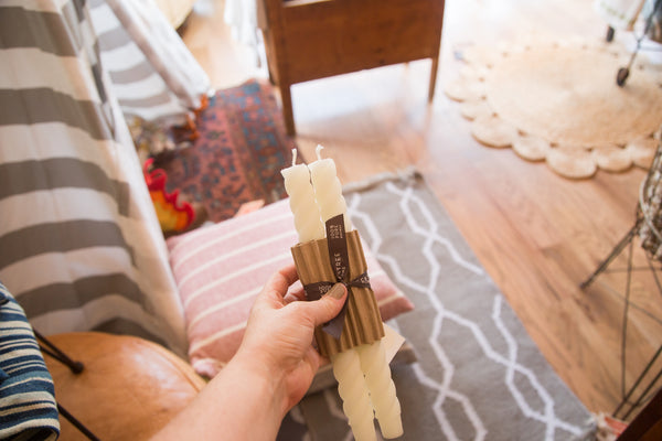 So beautiful and playful, these 10 inch rope design taper candles made by Greentree Home are just so sweet. Sold as a pair. Each candle is hand poured and individually finished in Catskills, NY. Lovingly made from 100% pure beeswax. Burn time: 15 hours. Note: All tapers have a 7/8" base form or a 3/4" bottom. This is a standard taper candle cup size.
